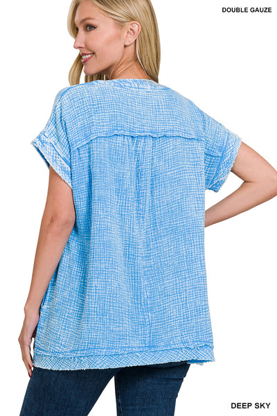 WASHED DOUBLE GAUZE RAW EDGE SHORT SLEEVE V-NECK SHIRT