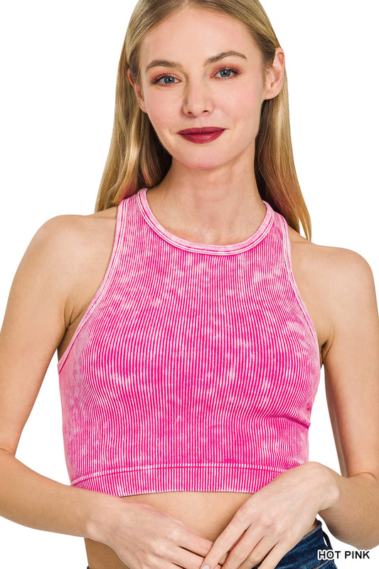 WASHED RIBBED CROPPED BRA PADDED V-NECK TANK TOP