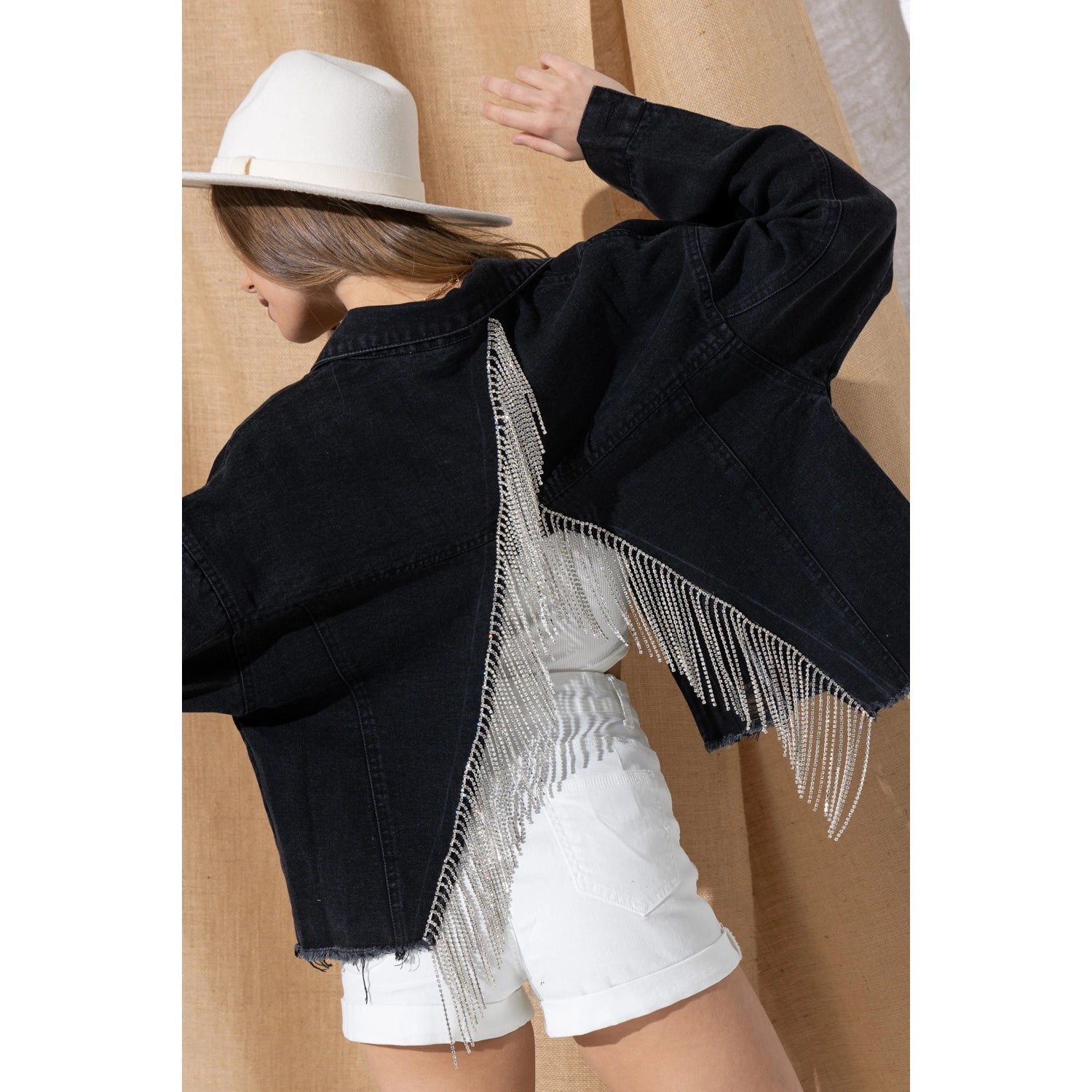 Distressed Washed Open Cross Rhinestone Fringe Back Denim Jacket