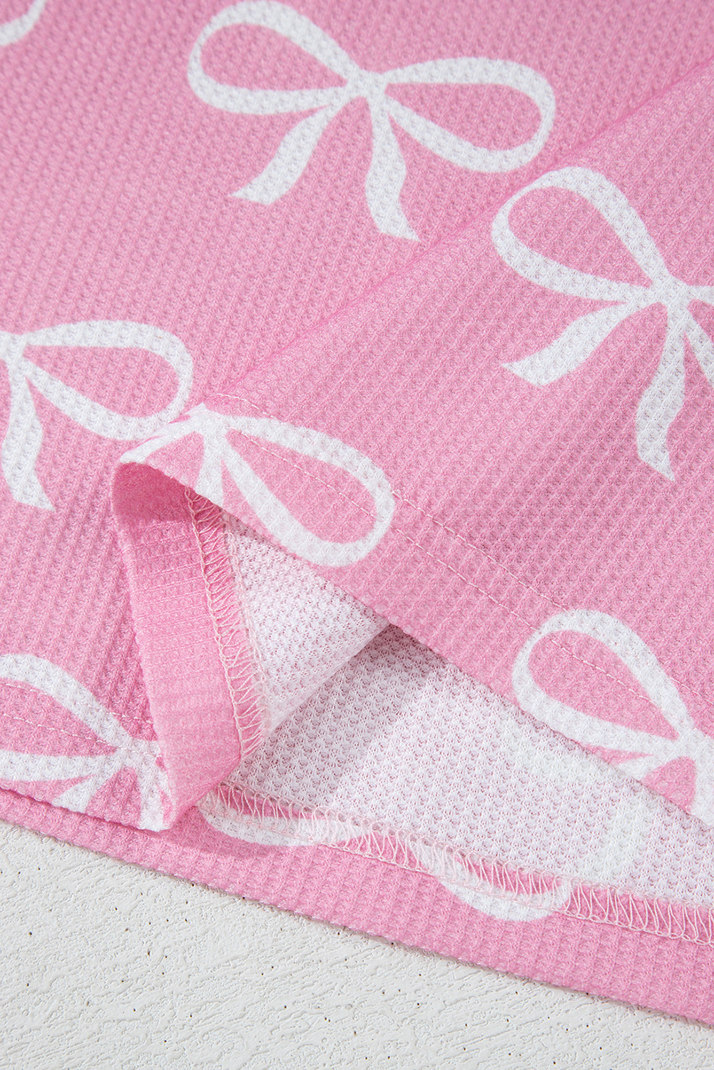 Pink Waffle Knit Bowknot Printed V Neck T Shirt And Shorts Set