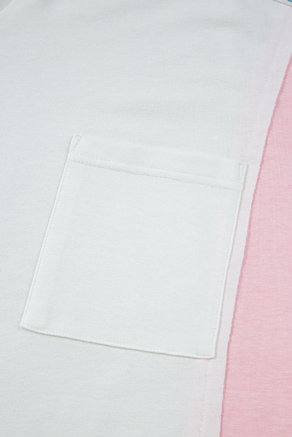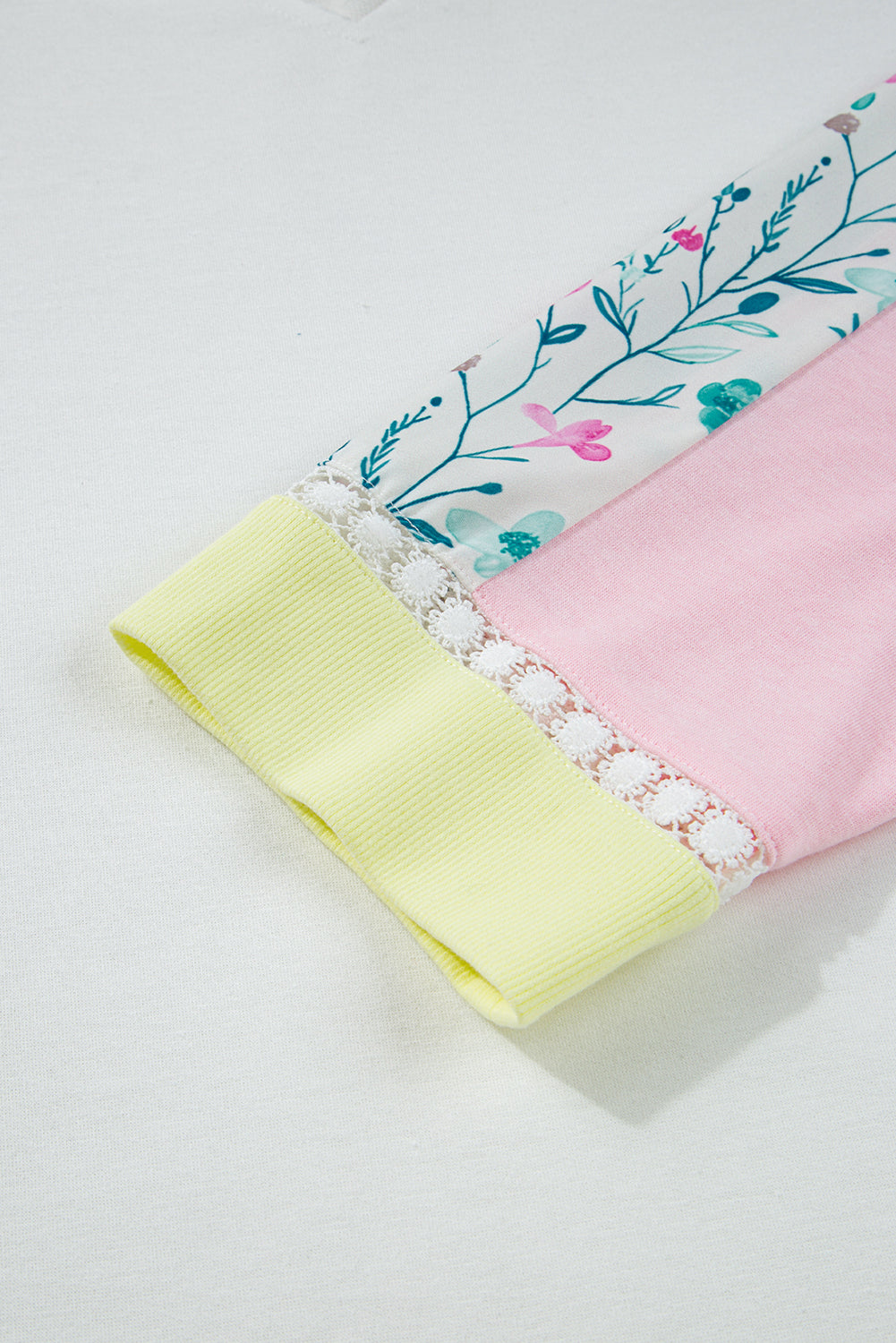 White Floral Colorblock Patchwork Notched Neck Long Sleeve Top